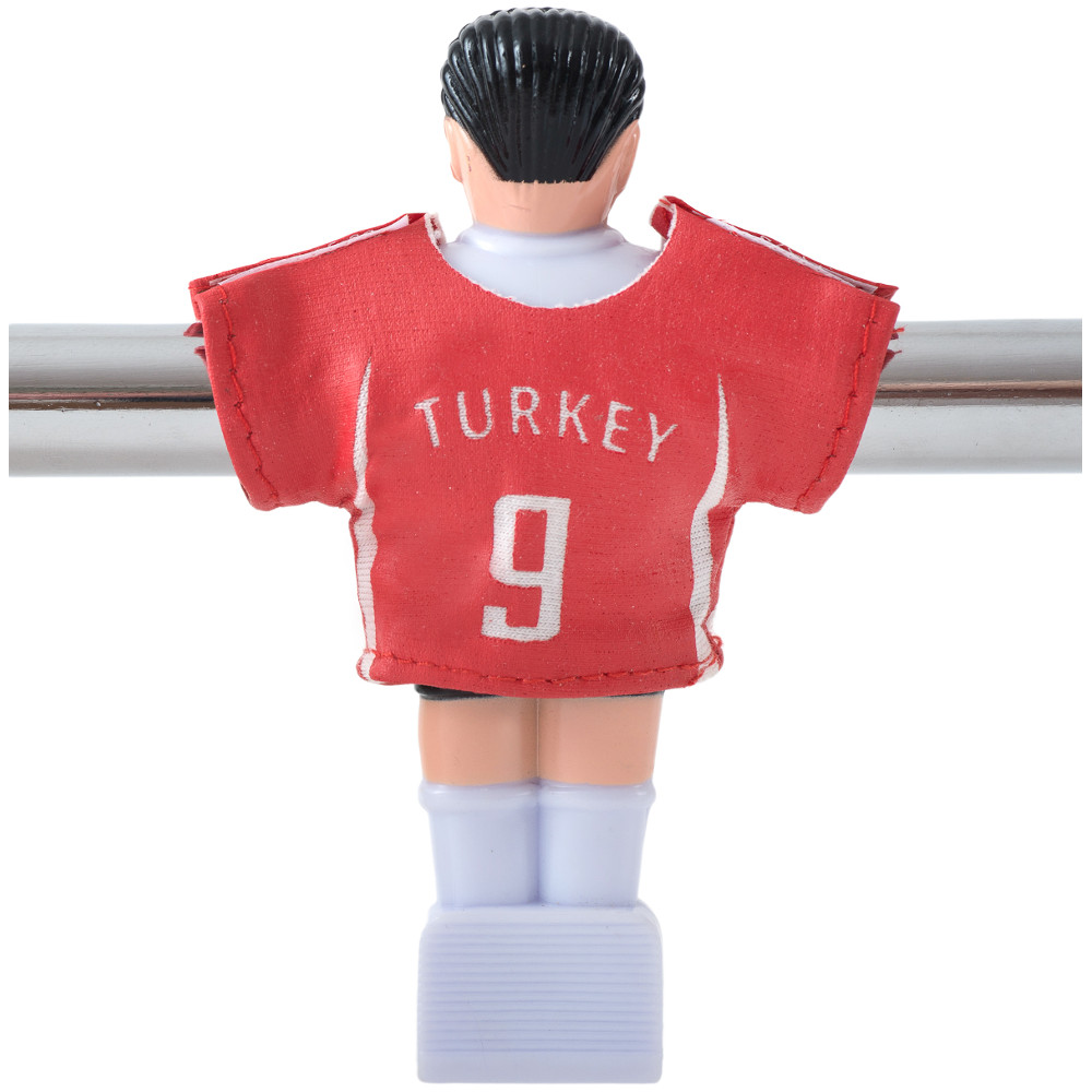 Die Kickertrikots sind an den Ärmeln mit Klettverschlüssen versehen und lassen sich ohne Demontage der Figuren wechseln.
