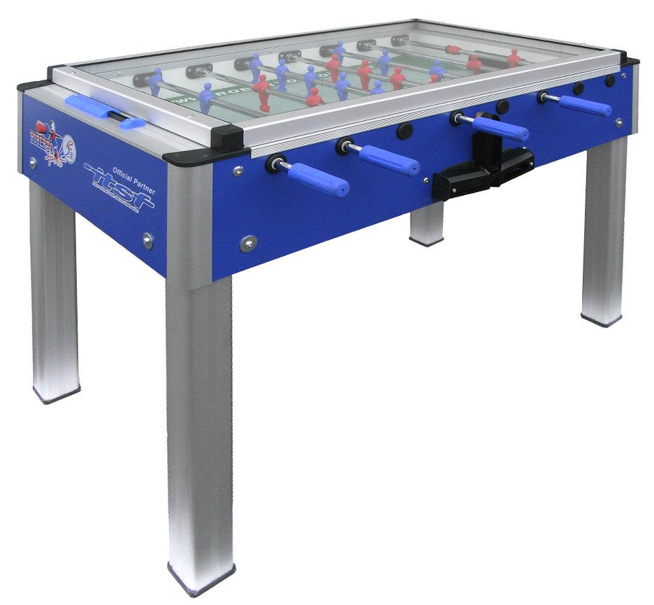 Das Spielfeld besteht aus einer verschleißfreien, sandgestrahlten und gehärteten Glasplatte (ESG, Einscheibensicherheitsglas) mit aufgesetzten Ecken und Längsbanden. Die 18 mm starken Sicherheits-Teleskopstangen mit fest aufgeschweißten Figuren machen den Tisch kindersicher.