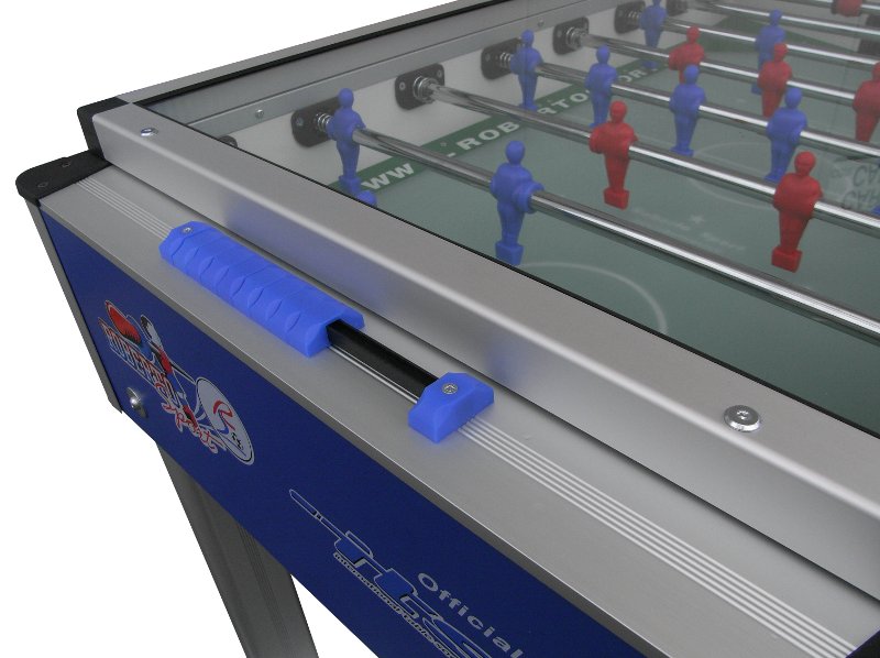 Das Spielfeld besteht aus einer verschleißfreien, sandgestrahlten und gehärteten Glasplatte (ESG, Einscheibensicherheitsglas) mit aufgesetzten Ecken und Längsbanden. Die 18 mm starken Sicherheits-Teleskopstangen mit fest aufgeschweißten Figuren machen den Tisch kindersicher.